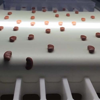 药片外观缺陷检测机是通过送料器将药品输送至视觉检测区域,利用高速相机捕捉传输带上运动的药片,实现连续拍摄。从药片进入检测领域开始,检测系统会实时追踪。图像处理系统根据拍摄的药片图像自动分析,综合判断药片是否合格。在药片即将离开检测区域之际,图像处理系统会将判断结果传达至逻辑控制系统,进而操控剔除分选系统,对不合格药片进行精确剔除。